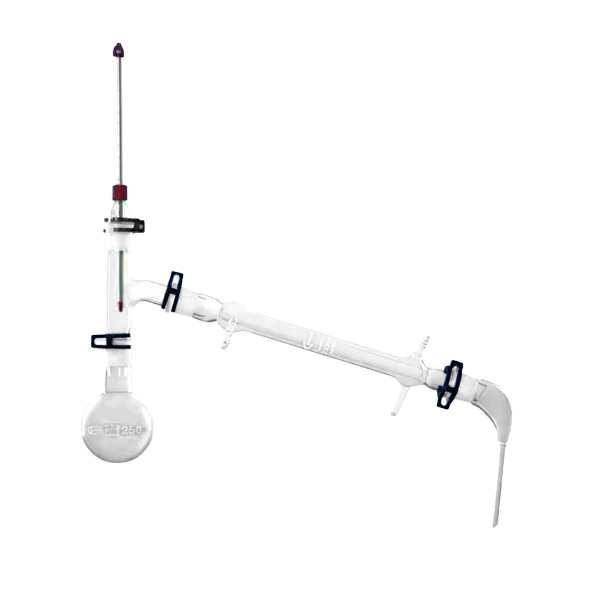 Vervaardigd van 3.3 borosilicaatglas van topkwaliteit. Inclusief 1 rechte koeler 250 mm, 1 kolf met ronde bodem 250 ml, 1 destillatiekop, 1 thermometer adapter, 1 gebogen collector, 1 thermometer (-10 tot +110 °C) en de benodigde POM-klemmen voor de slijpverbindingen. Alle slijpstukken zijn 29/32. De connector is voor buis met Øint. 8 mm. Aanbevolen te combineren met 2 statieven RTMM-300-001, 2 klemmen RPS3-025-001, 4 dubbele nootklemmen (bossheads) BOSS-001-004, de HEAM-250-001 verwarmingsmantel, SILT-008-005 siliconenslang en SGRE-025-100 vet voor geslepen verbindingen