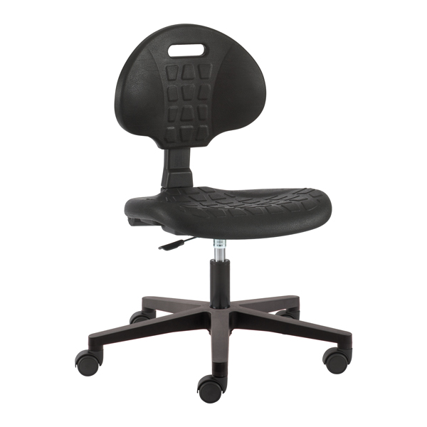 Vijf zwenkbare wielen, voor zittend werk op 75 cm hoogte. Materiaal zitting/rugleuning: antislip polyurethaan, gemakkelijk te reinigen. Bestand tegen schuren en reinigingsproducten. De zitting is in hoogte verstelbaar tussen 40 en 58 cm. Hoogteverstelling door gasdrukveer. Afmetingen van de zitting (breedte x diepte): 41 x 54 cm. Afmetingen van de rugleuning (breedte x hoogte): 42 x 39 cm. Onderstel: Zwart polyamide met glasvezel, diameter van de basis: 60 cm. Zonder armleuningen. Wordt ongemonteerd geleverd. 5 jaar garantie