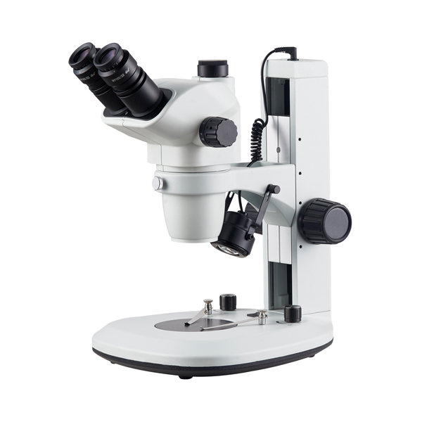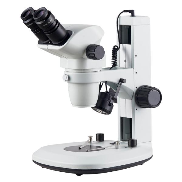 Geschikt voor industriële inspectie, elektronica, edelsteenkunde en kwaliteitscontrole. Verkrijgbaar in binoculaire of trinoculaire versie, met optisch systeem van het Greenough type en 45° gekantelde kop. 360° draaibaar, 54 -75 mm interpupilaire afstelling en bilaterale dioptriecorrectie ±5. Uitgerust met WF10X/22 mm oculairs en 0,67X tot 4,5X continue zoom (6,7:1 ratio). De microscoop levert een standaard vergroting van 6,7X tot 45X, uitbreidbaar tot 270X met optionele accessoires. Dankzij de werkafstand van 105 mm kunnen grote objecten comfortabel worden geobserveerd. Scherpstellen wordt geregeld door stelschroeven met bilaterale bediening en de basis bevat een transparante schijf met preparaatklemmen en een instelbaar dubbel LED verlichtingssysteem (invallend en doorvallend licht) met intensiteitsregeling. 110-240 V, 50/60 Hz. Garantie 2 jaar