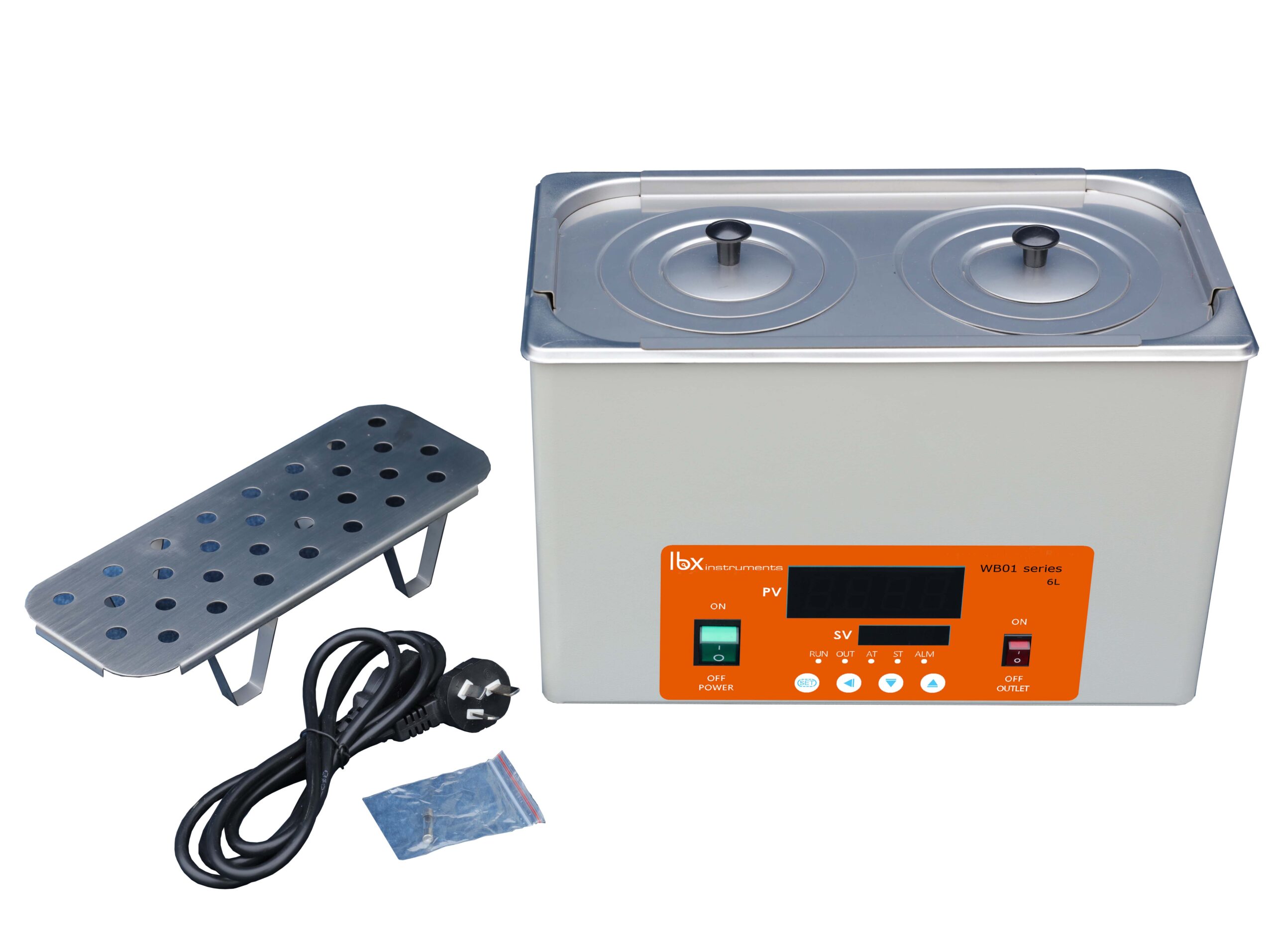 Metalen chassis, buitenkant met antioxiderende epoxy coating, en roestvrijstalen waterbadschalen (type 304). Digitale temperatuurregeling tussen omgevingstemperatuur +5 °C en 100 °C (Resolutie: 1 °C). Kan continu werken of worden geprogrammeerd door middel van een digitale timer om in specifieke tijdsperioden te werken, vanaf 1 min. tot 9999 min., met geluidsignaal. Dubbele digitale weergave van temperatuur en tijd. Alarm bij oververhitting van het bad. Inclusief weerstandsafdekplateau, afneembaar deksel met openingen (11 cm) en reductieringen (8 en 5 cm). Met afvoerslang (behalve model TWBA-001-001). Vul met gezuiverd water en een kleine hoeveelheid kraanwater om de geleidbaarheid te garanderen. 220 V / 50-60 Hz. 2 jaar garantie