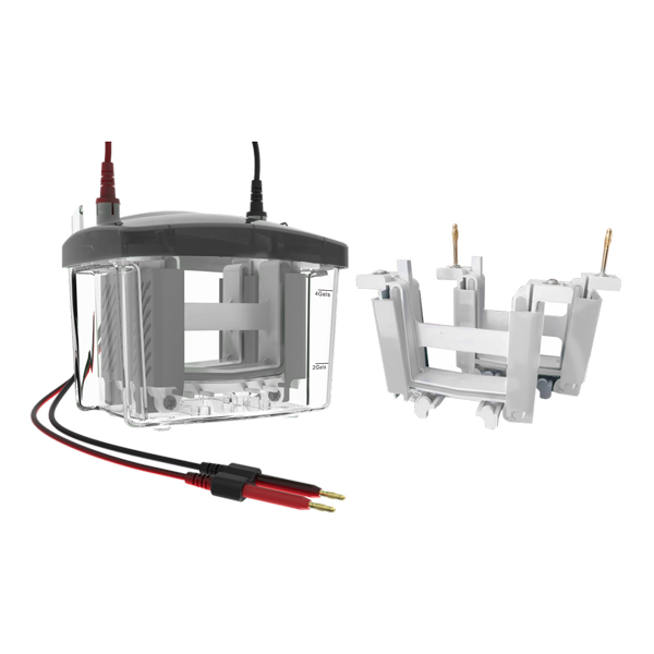Robuust verticaal systeem voor PAGE en SDS-PAGE. Inclusief glasplaten met geïntegreerde afdichtingen om geluitloop te voorkomen. Frame met klepsluiting voor een nauwkeurige uitlijning. Speciale kammen die de polymerisatie van de gel niet verstoren. Mogelijkheid om 4 gels tegelijkertijd te observeren. Standaard looptijd van 45 minuten bij 200 V. Compatibel met Volt TX90-overdrachtssysteem